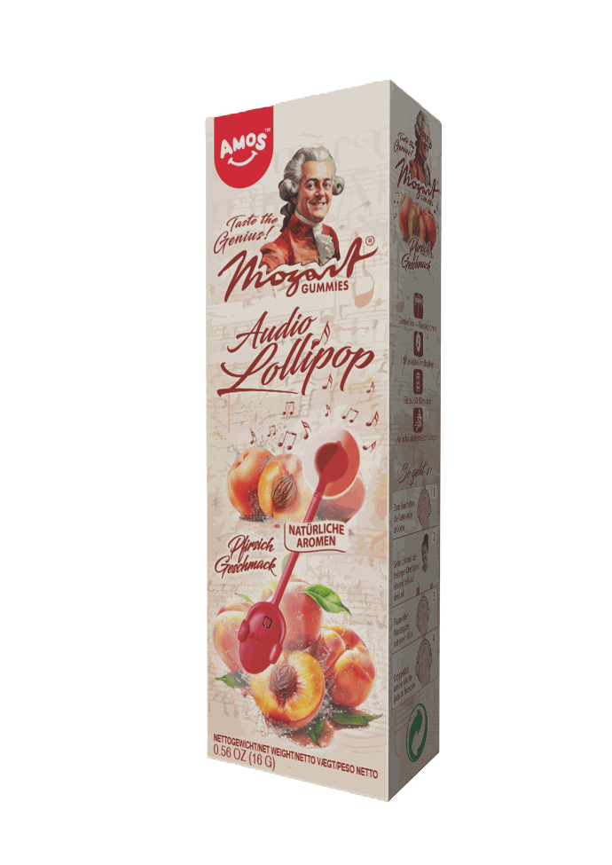 Ob Sie sich von W.A. Mozarts Klängen verführen lassen oder die Pause-Taste für einen Moment der Stille nutzen - unser innovativer Lollipop entführt Sie in eine Welt klangvoller und süßer Harmonie!"